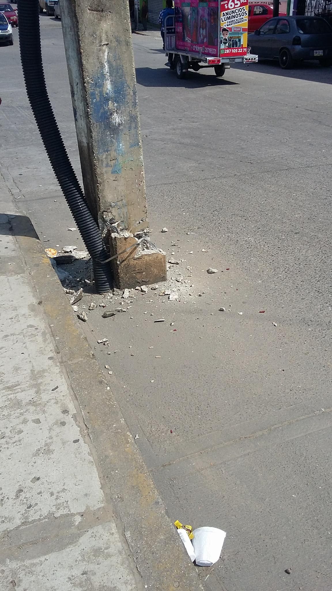 Este es al parecer uno de los daños colaterales de los hechos que se dieron el dia de ayer, en esta interseccion en la que una unidad al maniobrar en reversa golpeo el poste y lo dejo asi como se aprecia en la imagen.